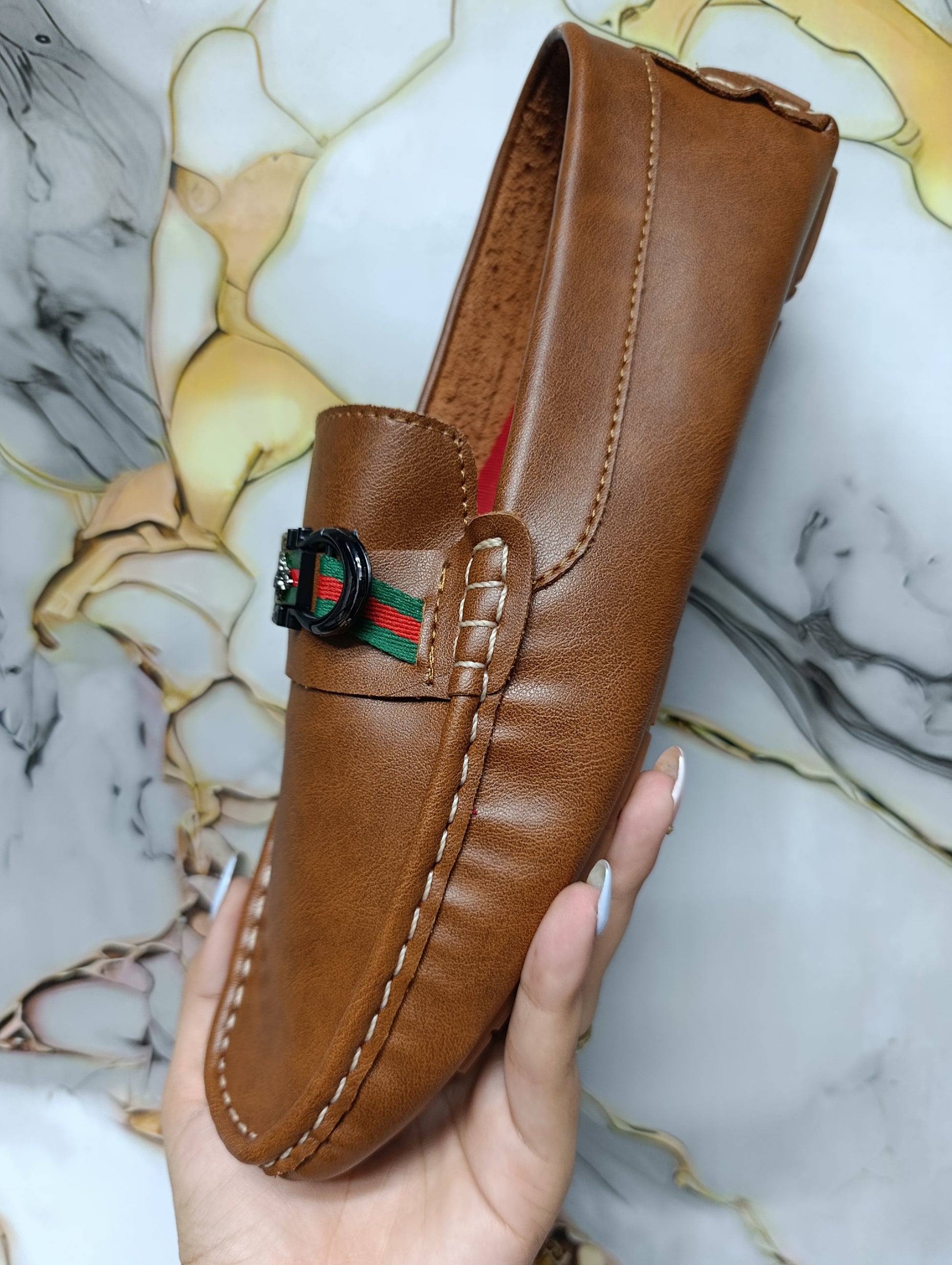 Cuero sintético o genuino, con costuras a la vista. El diseño es característico del estilo de mocasines con el detalle de la cincha web de Gucci. Presenta una hebilla decorativa y costuras blancas contrastantes en la pala (empeine). El estilo combina la comodidad de un mocasín sin cordones con una suela de goma con tacos, ideal para conducir.